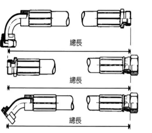 軟管總成長(zhǎng)度:軟管總成長(zhǎng)度是從一個(gè)軟管接頭端面到另一個(gè)軟管接頭端面的水平距離。這個(gè)長(zhǎng)度允許±1%的制造誤差。如果長(zhǎng)度過長(zhǎng),會(huì)影響外觀并增加成本;如果長(zhǎng)度過短,軟管在受壓伸展或壓縮時(shí)沒有足夠的伸縮余地,可能會(huì)導(dǎo)致軟管被破壞。
