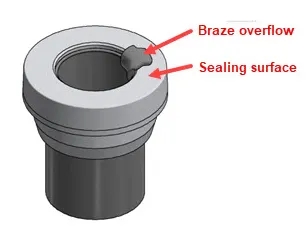 釬焊是一項復(fù)雜的操作,可能會導(dǎo)致密封面上出現(xiàn)焊渣溢流。由于密封面被破壞,就可能造成鋼管螺母處的泄漏。焊條熔化時產(chǎn)生的熱量使密封面位置可能產(chǎn)生焊渣溢流,焊條融化液會流向更高溫度的地方。一旦發(fā)生融化液溢流,應(yīng)立即轉(zhuǎn)移到襯套的小直徑端進(jìn)行焊接,使融化液均勻流過接頭。如果發(fā)現(xiàn)釬焊溢流,裝配前請取下受影響的襯套,然后在該位置處重新釬焊一個新的襯套。