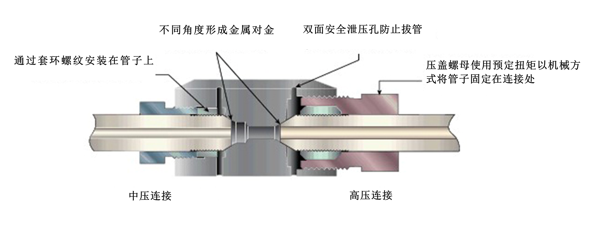 如果使用高壓工具加工中壓管,則會(huì)將壁厚降低到安全限值以下,并可能導(dǎo)致災(zāi)難性故障。同樣,將高壓接頭與中壓管組合使用,則意味著公接頭和母接頭將無(wú)法正確安裝??赡苈菁y看起來(lái)是匹配的,但壓蓋螺母不會(huì)嚙合到系統(tǒng)保持安全所需的深度。高壓和中壓接頭中所用金屬的機(jī)械性能差異很大,所以中壓裝置無(wú)法承受高壓應(yīng)用條件。