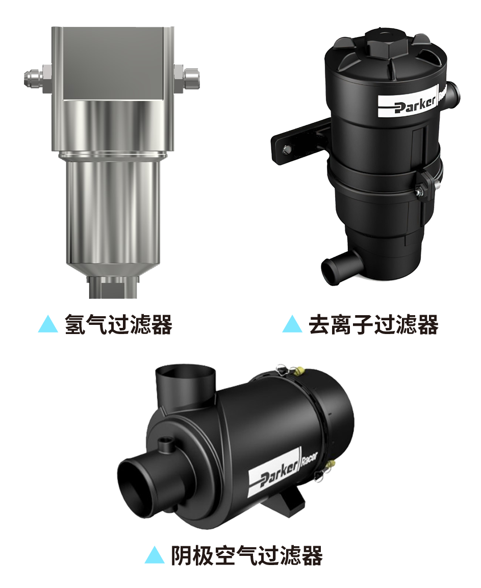 質(zhì)子交換膜燃料電池對(duì)氫氣及空氣的清潔度和流量控制要求非常高,不但微小顆粒的過濾精度要優(yōu)于燃油發(fā)動(dòng)機(jī)要求,同時(shí)對(duì)酸、堿、氨、VOCs等為代表的有害物質(zhì)也有著嚴(yán)格的過濾要求。派克漢尼汾針對(duì)這一獨(dú)特需求,研發(fā)推出的氫氣過濾器可有效去除氫氣氣流中的顆粒和液體,保障進(jìn)入電堆反應(yīng)的氫氣清潔度;而推出的陰極空氣過濾器則可去除空氣氣流中的雜質(zhì)顆粒和有害氣體。此外,離子交換器可以將冷卻液中的電導(dǎo)率降至理想水平,保護(hù)并延長燃料電池壽命。