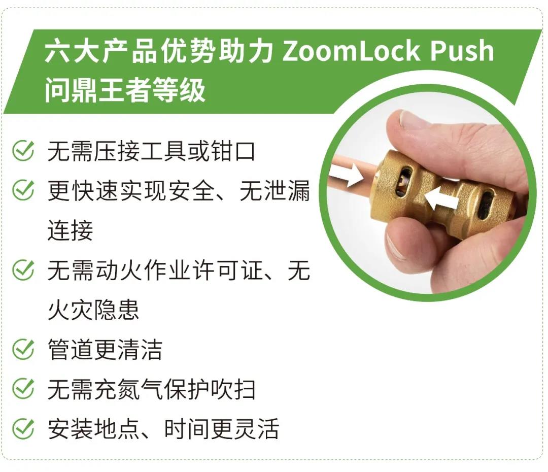 如果空調(diào)制冷管路連接技術(shù)也有段位的話,那么ZoomLock Push推入/按壓式接頭一定是王者等級(jí)!它不僅延續(xù)原ZoomLock產(chǎn)品的尊貴血統(tǒng),堅(jiān)守安全、清潔的無泄漏連接品質(zhì),更另辟蹊徑,進(jìn)一步加速管道安裝。