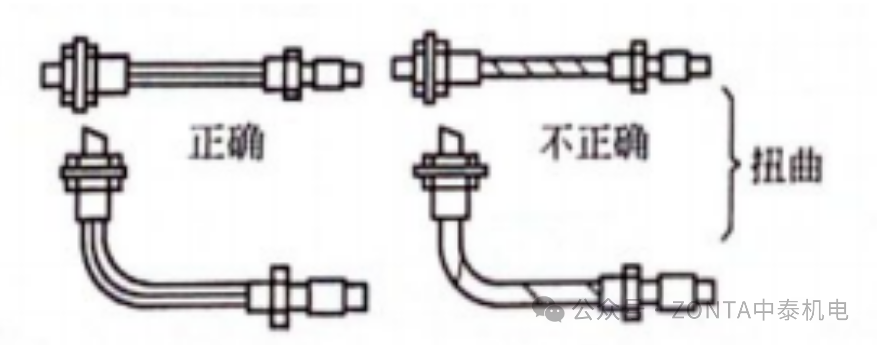 6、在直角拐彎處最好不用軟管,否則在壓力交變的工況下,會因軟管彎曲處的長度和曲率半徑的變化而疲勞導(dǎo)致破裂,產(chǎn)生漏油,使用不銹鋼軟管時(shí)更應(yīng)注意。