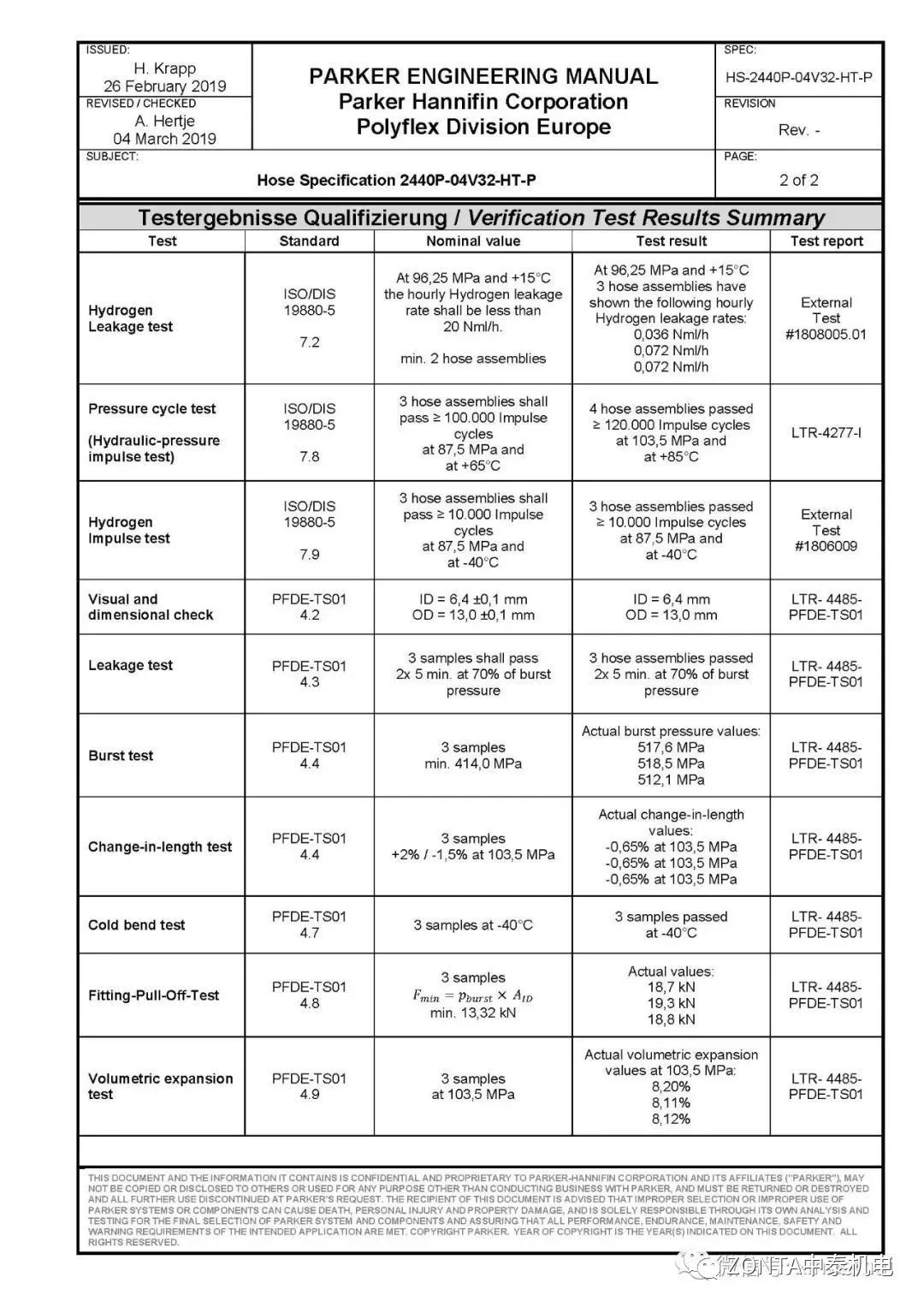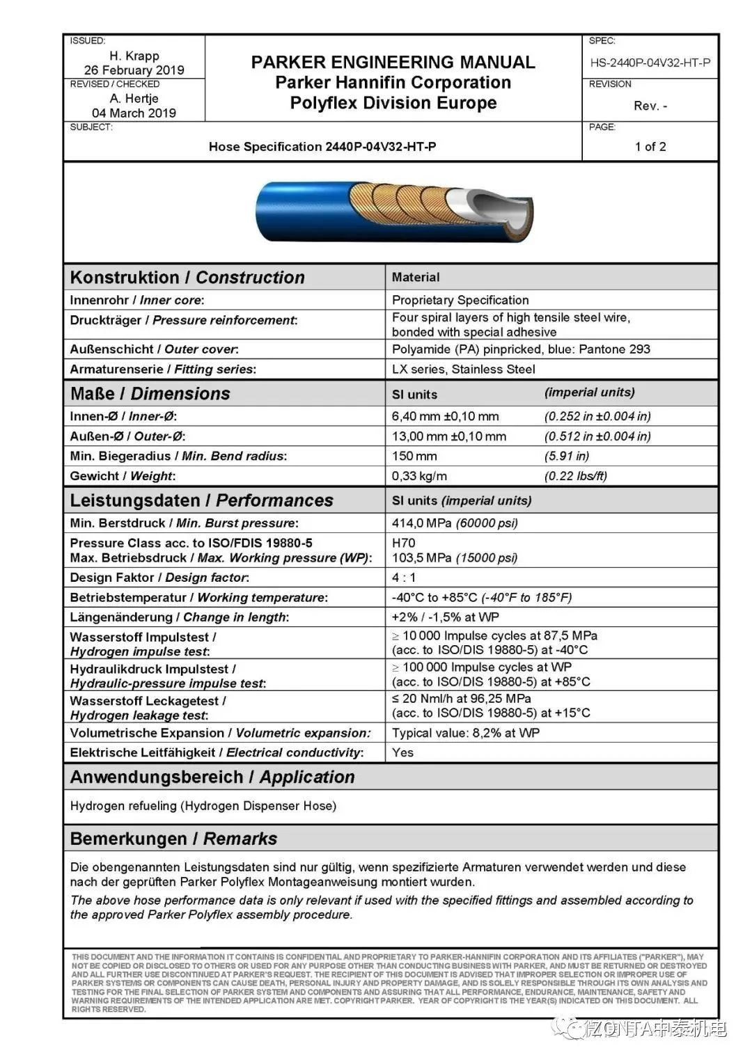 派克2440P-04V32-HT-P氫氣軟管工作壓力高達875bar,符合ISO-19880-5 要求,可在-40℃的低溫環(huán)境下實現(xiàn)快速加氫。該軟管具有很高的耐磨性、很好的耐臭氧能力、很強的抗紫外線能力、壽命周期長,適合于戶外安裝應(yīng)用。另外其小彎曲半徑的特點使其可應(yīng)用于狹小的安裝空間。最后,該軟管不但能有效降低氫氣滲透,還能顯著提升氫氣系統(tǒng)運行的安全,是氫能源系統(tǒng)的理想選擇。